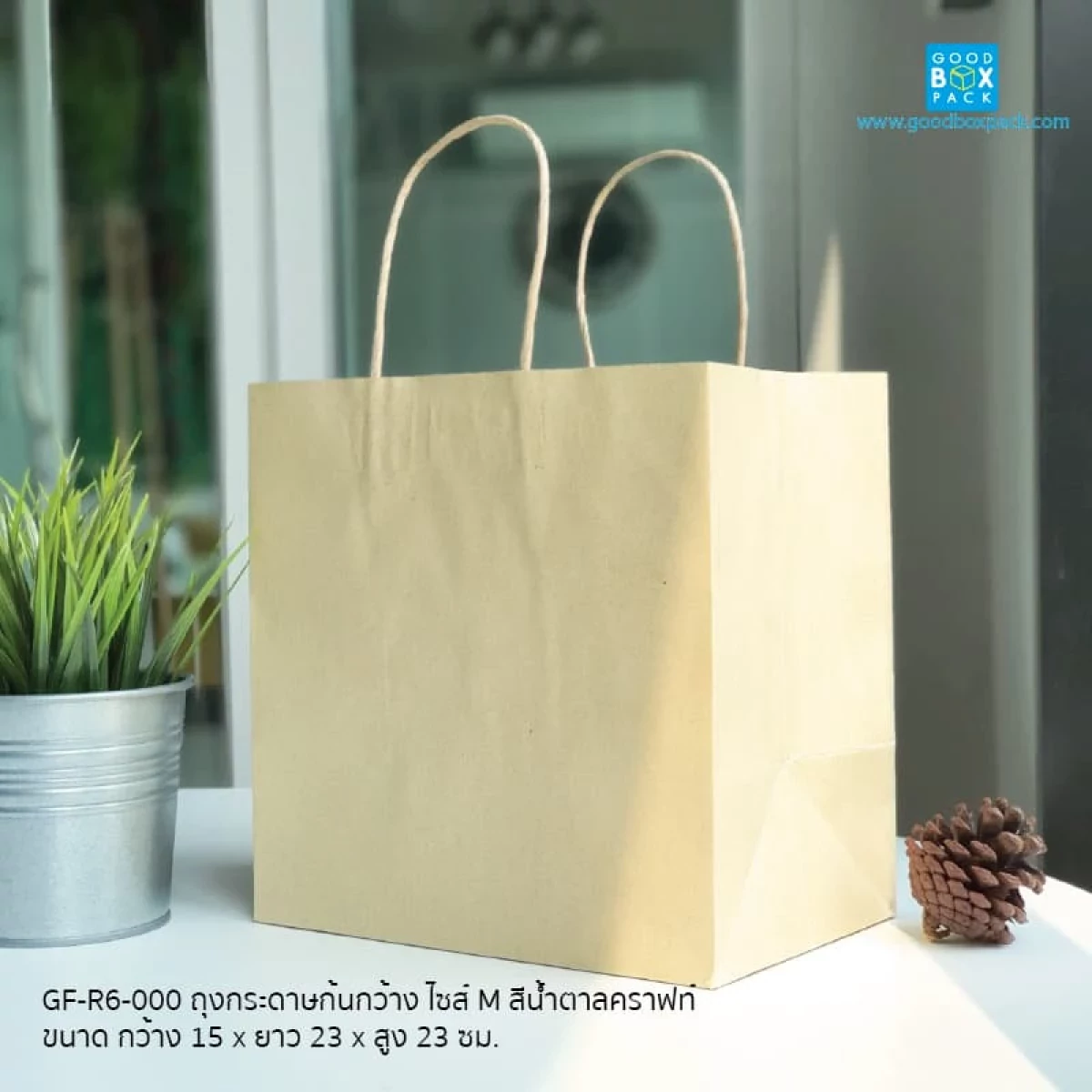 ถุงกระดาษก้นกว้าง ไซส์ M สีน้ำตาลคราฟท์ แพ็คละ 25 ใบ ลัง 450 ใบ ขนาด กว้าง 15 x ยาว 23 x สูง 23 ซม.