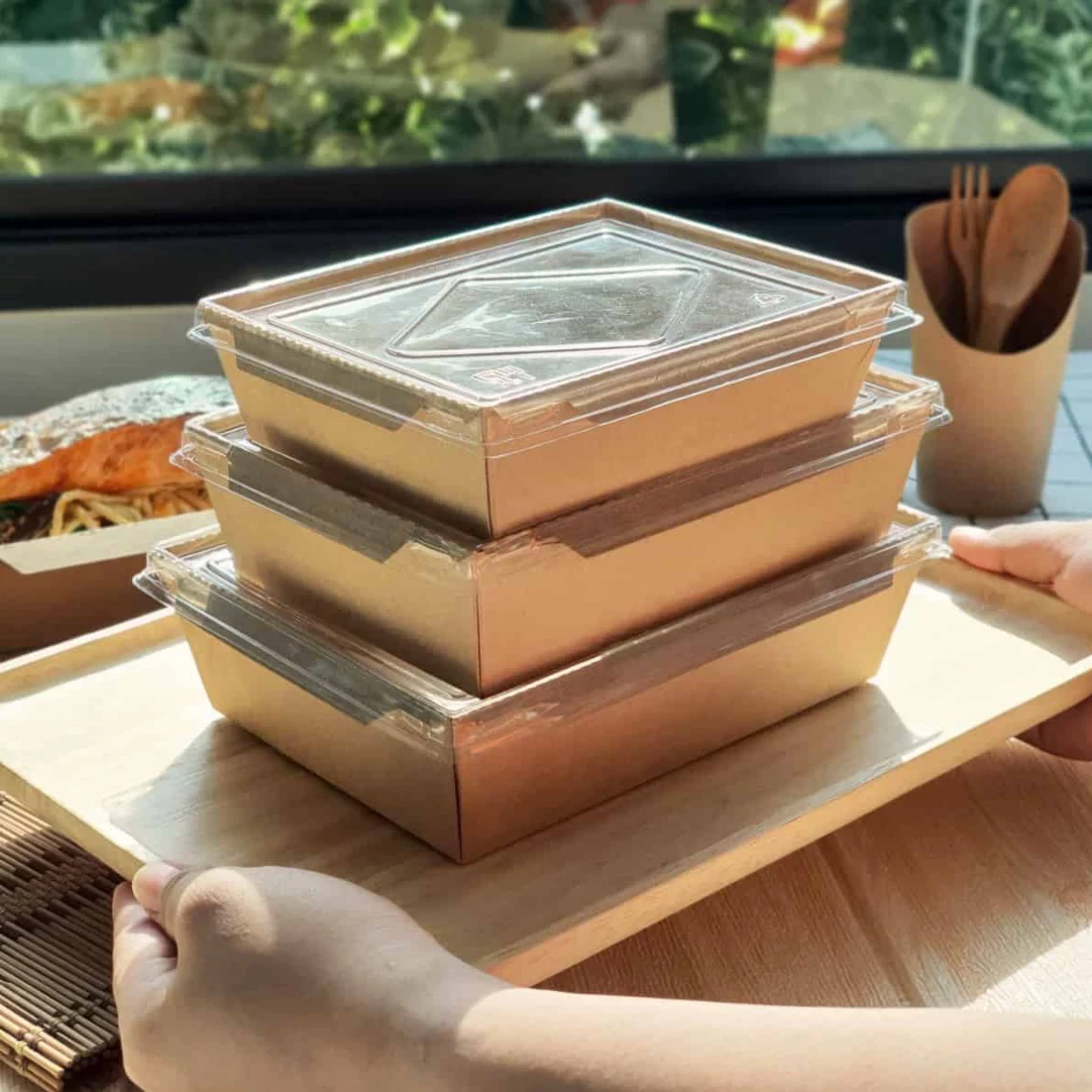 กล่องอาหารคราฟท์ พร้อมฝา 1200 มล. แพ็คละ 50 ใบ ลังละ 300 ชุด ขนาด กว้าง 14 x ยาว 20 x สูง 5 ซม. (ก้นกว้าง 12 x ยาว 18 ซม.)